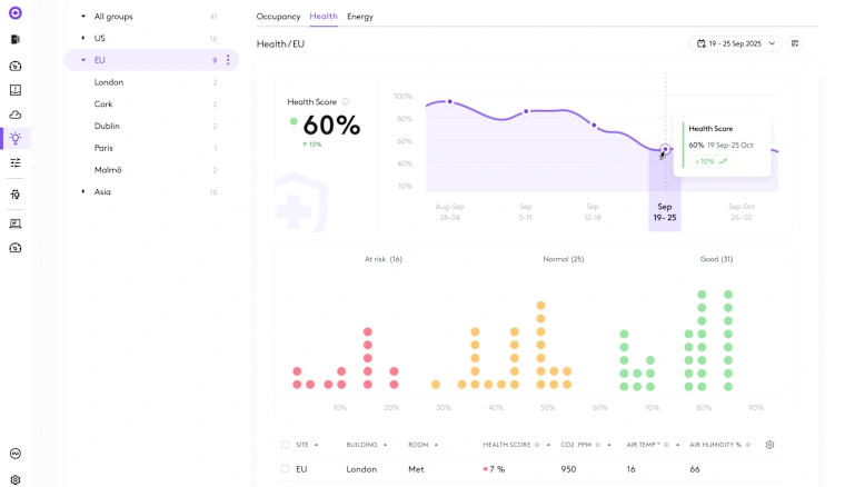 Tăng cường sức khỏe tại nơi làm việc với thông tin hữu ích về chất lượng không khí. Tìm hiểu sâu hơn các dữ liệu môi trường như nhiệt độ, mức CO2, vật chất dạng hạt và hợp chất hữu cơ dễ bay hơi (VOC) cũng như nhận đề xuất cải thiện.