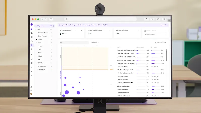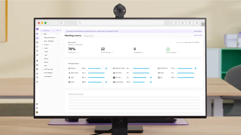 Sử dụng các công cụ quản lý thiết bị và không gian tiên tiến của chúng tôi, như Truy cập giao diện người dùng từ xa, Đặt chỗ và Thông tin chuyên sâu, thông qua Logitech Sync.